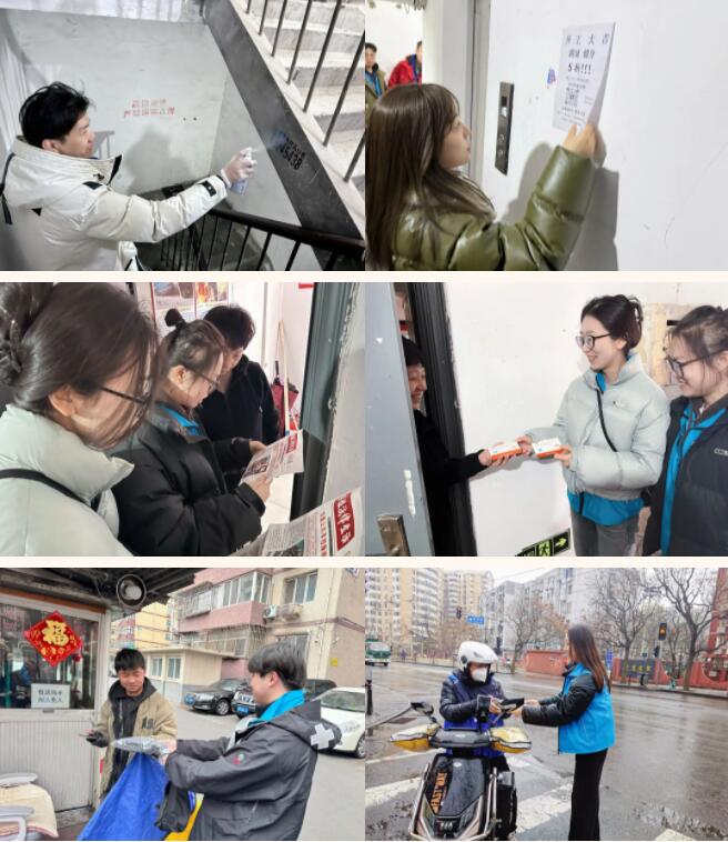 活動(dòng)當(dāng)天,雨雪紛紛,大家身著整齊的志愿服,懷揣著滿腔熱情,投身于各式各樣的志愿服務(wù)中。服務(wù)范圍廣泛而深入,不僅有對(duì)社區(qū)環(huán)境的整治美化,如清理樓道垃圾、清除樓道墻面、地面小廣告等,還入戶宣傳法律知識(shí),引導(dǎo)居民依法維護(hù)自身權(quán)益,并開展了社區(qū)暖心服務(wù),向社區(qū)居民發(fā)放降壓藥,向社區(qū)快遞員、外賣員贈(zèng)送保暖手套,提供生活上的幫助和關(guān)懷。