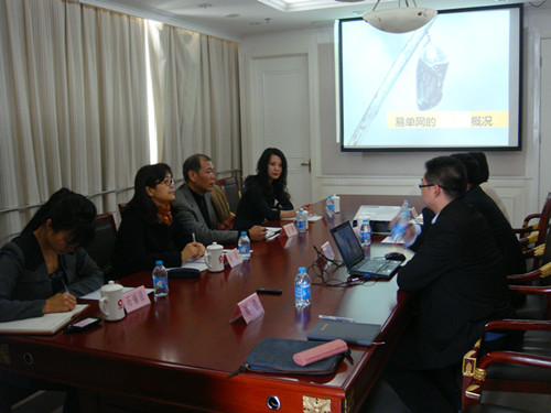 2013年3月27日下午,商務(wù)部對(duì)外貿(mào)易司促進(jìn)處處長(zhǎng)晁寧、副處長(zhǎng)周勍來(lái)易單網(wǎng)考察調(diào)研。中建材集團(tuán)進(jìn)出口公司常務(wù)副總經(jīng)理吳堅(jiān)、企管部經(jīng)理王立鶴、易單網(wǎng)運(yùn)營(yíng)總監(jiān)羅振立出席了會(huì)議并與商務(wù)部領(lǐng)導(dǎo)進(jìn)行了深入交流。易單網(wǎng)運(yùn)營(yíng)總監(jiān)羅振立首先就易單網(wǎng)的定位、優(yōu)勢(shì)、盈利模式、目前的工作進(jìn)展以及未來(lái)的規(guī)劃等方面向商務(wù)部領(lǐng)導(dǎo)作了